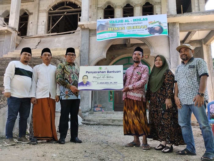 Di lokasi ini H. agus Aras menyerahkan secara simbolis Bantuan Dana Hibah sebesar 200 juta. Menurut ketua Panitia Pelaksana Pembangunan Masjid Al Ikhlas Dana Hibah tersebut dipakai untuk membeli kubah masjid (170 juta) dan lebihnya dibelikan kusen dan kebutuhan lain yg mendesak
